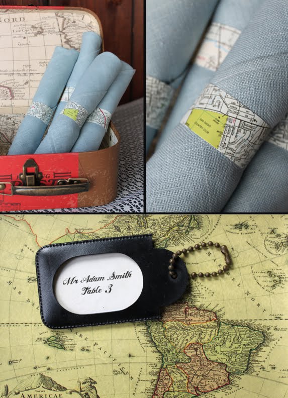 I picked up a few new items and while assembling them for a "look what I got" shoot... I saw a theme to my objects and just decided to go with it! This would be the perfect wedding theme if you and your honey love to travel. Or maybe you met while traveling? Incorporating your hobbies, interests and love story into your wedding events is key to making it uniquely yours! Infusing travel details into your wedding ceremony and reception is a fun touch... but you can also play up this theme for your engagement party or co-ed shower. Use postcards as invites, place settings, menu cards or table name cards. I love old vintage suitcases, and they work great for stashing blankets for guests (in case of a chilly outdoor reception) and they are a cute spot for guests to place their cards or small gifts. Also, maps are inexpensive, and can be used in a variety of ways... placemats, napkin ties, or garland just to name a few.